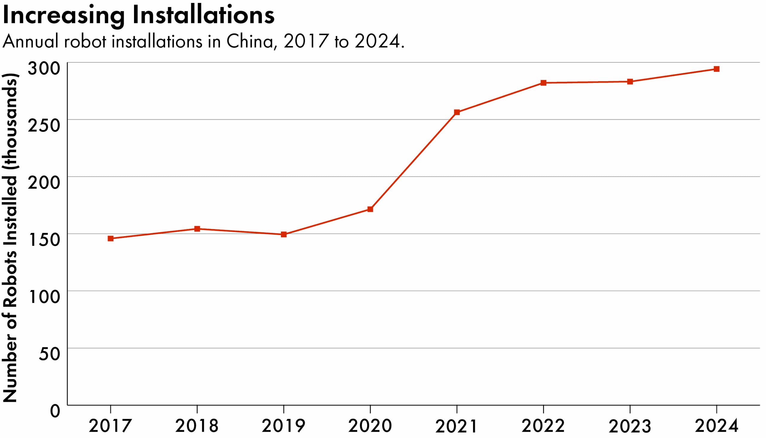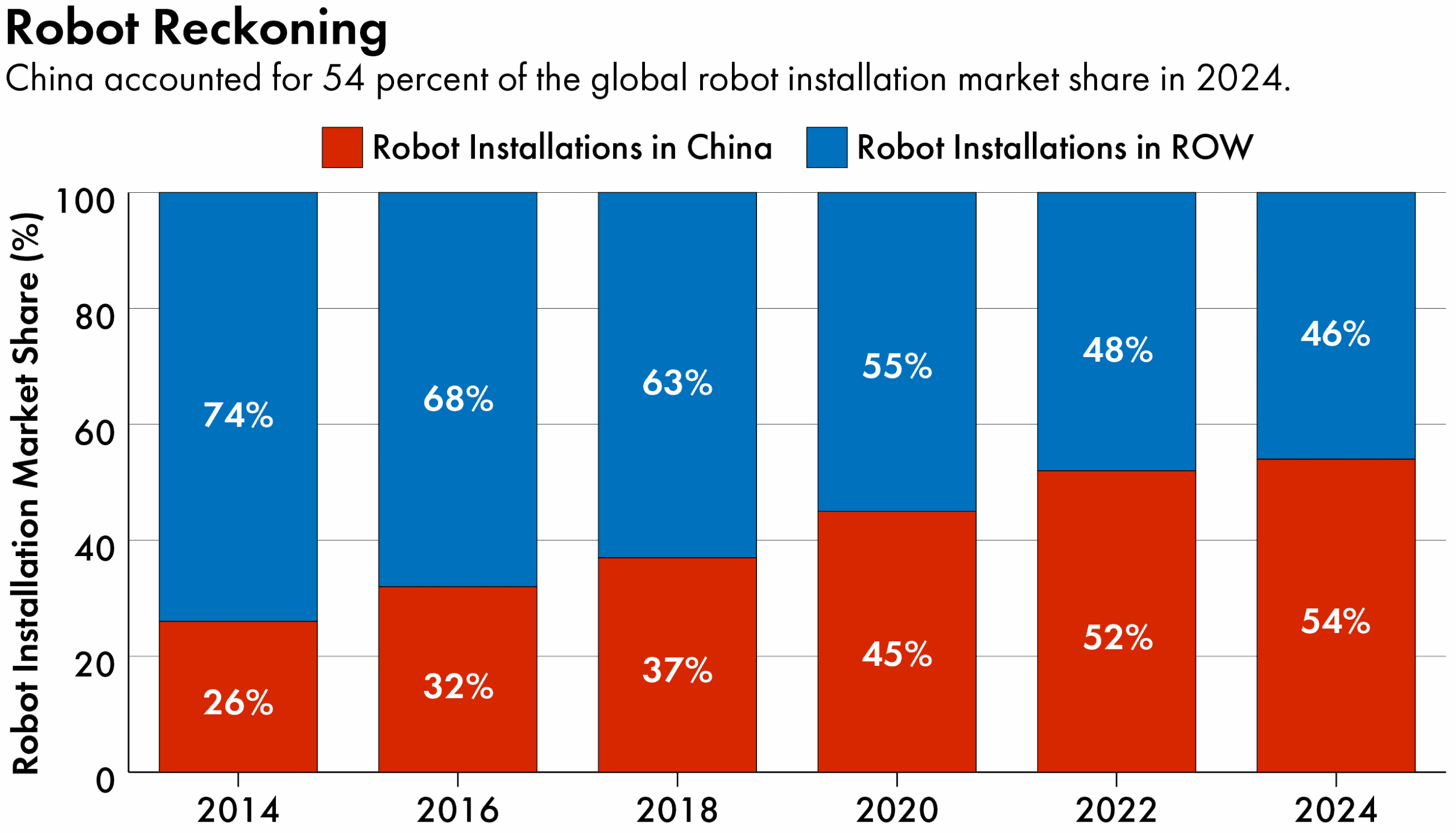 In 2014, China accounted for a hefty 26 percent of all robot installations, making it already the world’s largest robotic market. By 2024, that share had more than doubled to 54 percent. The most recent data shows that 295,000 industrial robots were installed in China in a single year — the highest annual total ever recorded.
