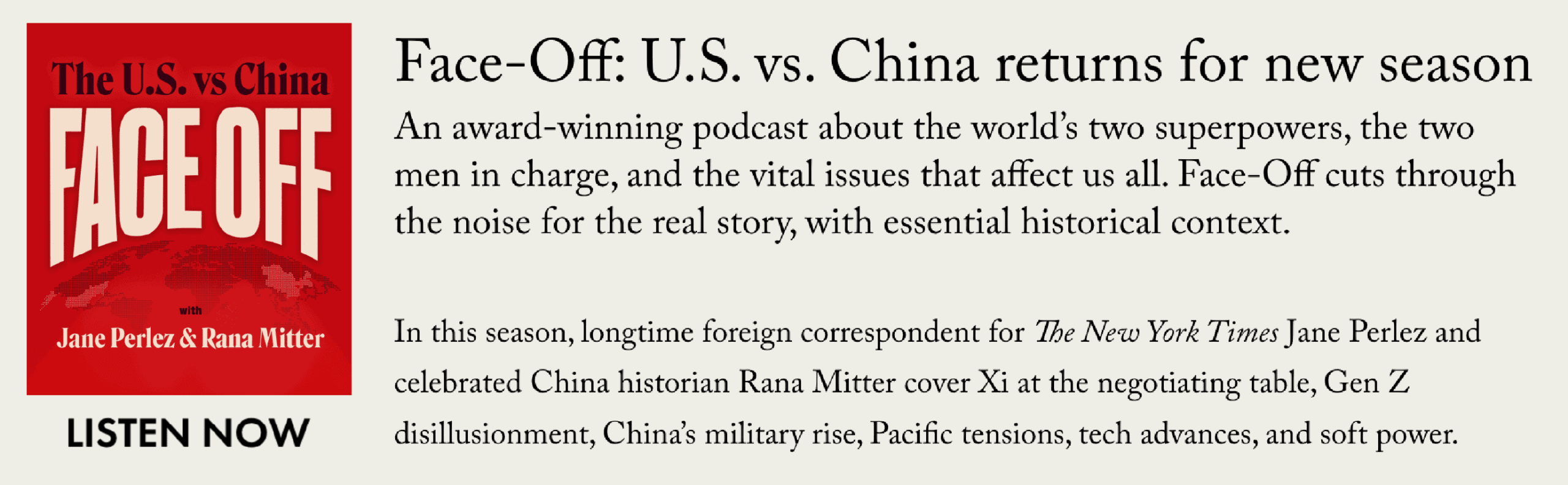 Pulitzer Prize-winning journalist Jane Perlez was a reporter for The New York Times in China from 2012 and 2019, serving as Beijing bureau chief — a stint that followed other roles as a foreign correspondent in Austria, Poland, Nairobi, Jakarta and Islamabad. More recently she has been the presenter of the podcast Face Off: The U.S. vs China, the latest series of which has now become available. The episodes this time round cover some of the hottest topics related to China and its relationsh