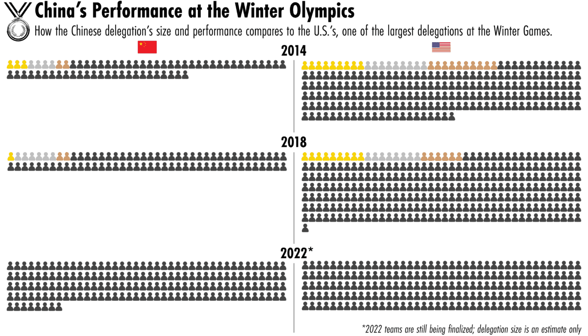 “The public is used to [Chinese] domination in the summer Olympics. That’s just not the case in the winter games. So they’re looking for other ways to show that they’ve been successful,” says Mark Dreyer, the author of Sporting Superpower: An Insider’s View on China’s Quest to be the Best. “If [the Chinese delegation] can say we’ve got like 150 [athletes]… that in itself will be something that they can hold up and say ‘look at the progress we’ve made.’”