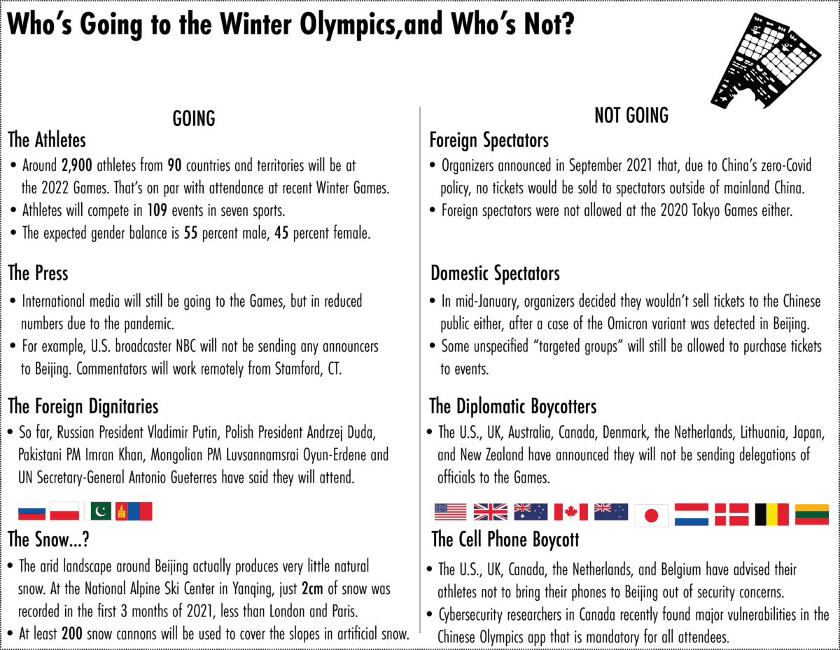The Chinese public won’t get to see the Games up close either — organizers announced last week that no tickets would be sold to the public, after a case of the Omicron variant was found in the capital city.