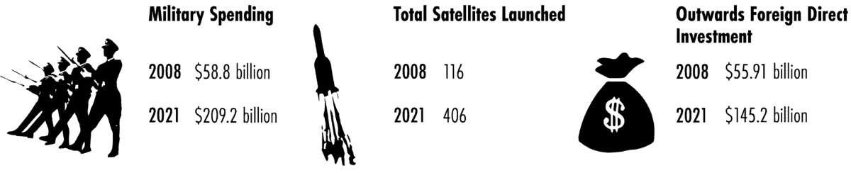 Historians see the 2008 Olympics as a symbolic “coming out” to the world for China. But it marked a tangible economic coming out too, as outward foreign direct investment more than doubled that year. Then-Chinese president Hu Jintao promoted his signature ideology of a “harmonious society” to visiting world leaders, but that same year Beijing also sharply increased its military spending. On measures of hard power China has seen significant increases in spending from 2008 to today: