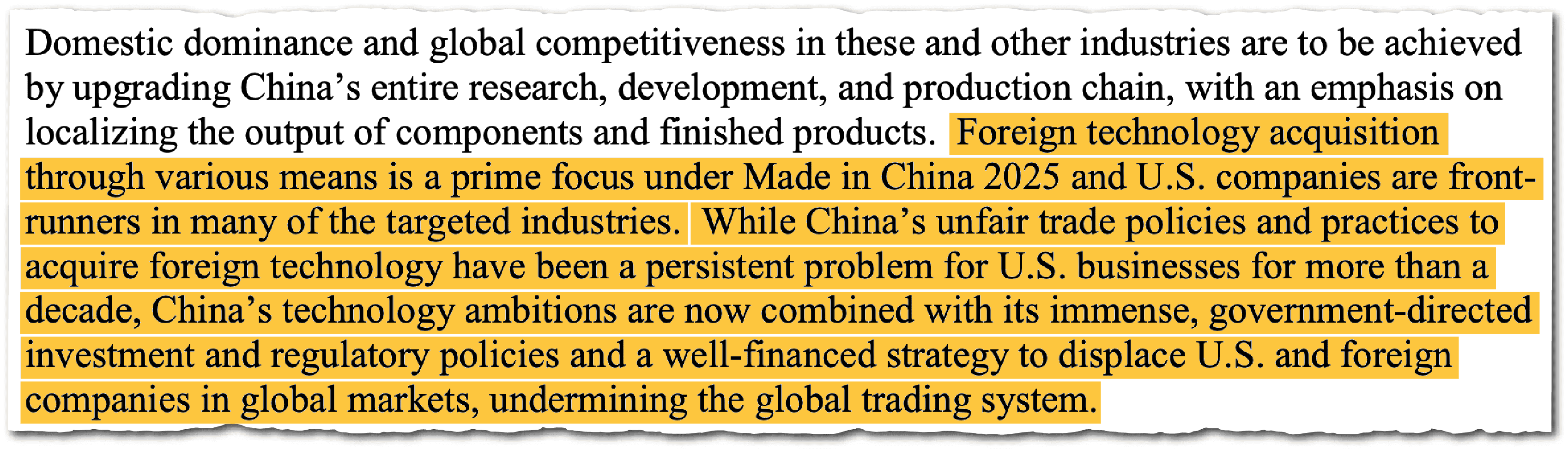 But that is not to say that all has gone according to plan for Beijing’s strategists. While Made in China 2025 was launched to great fanfare at home, it received a frostier reception abroad. Business leaders were some of the first to sound the alarm, with the European Chamber of Commerce in China issuing a dire report in 2017 warning that the strategy “amounts, in large part, to an import substitution plan.” And by 2018, the strategy was mentioned 116 times in Robert Lighthizer’s 2018 Section 301 report, which justified the U.S. tariffs that kicked off the first U.S.-China trade war. The initiative was also cited as a motivator for other measures, including the 2018 law that strengthened the powers of the Committee on Foreign Investment in the United States (CFIUS) and the U.S. semiconductor export controls.