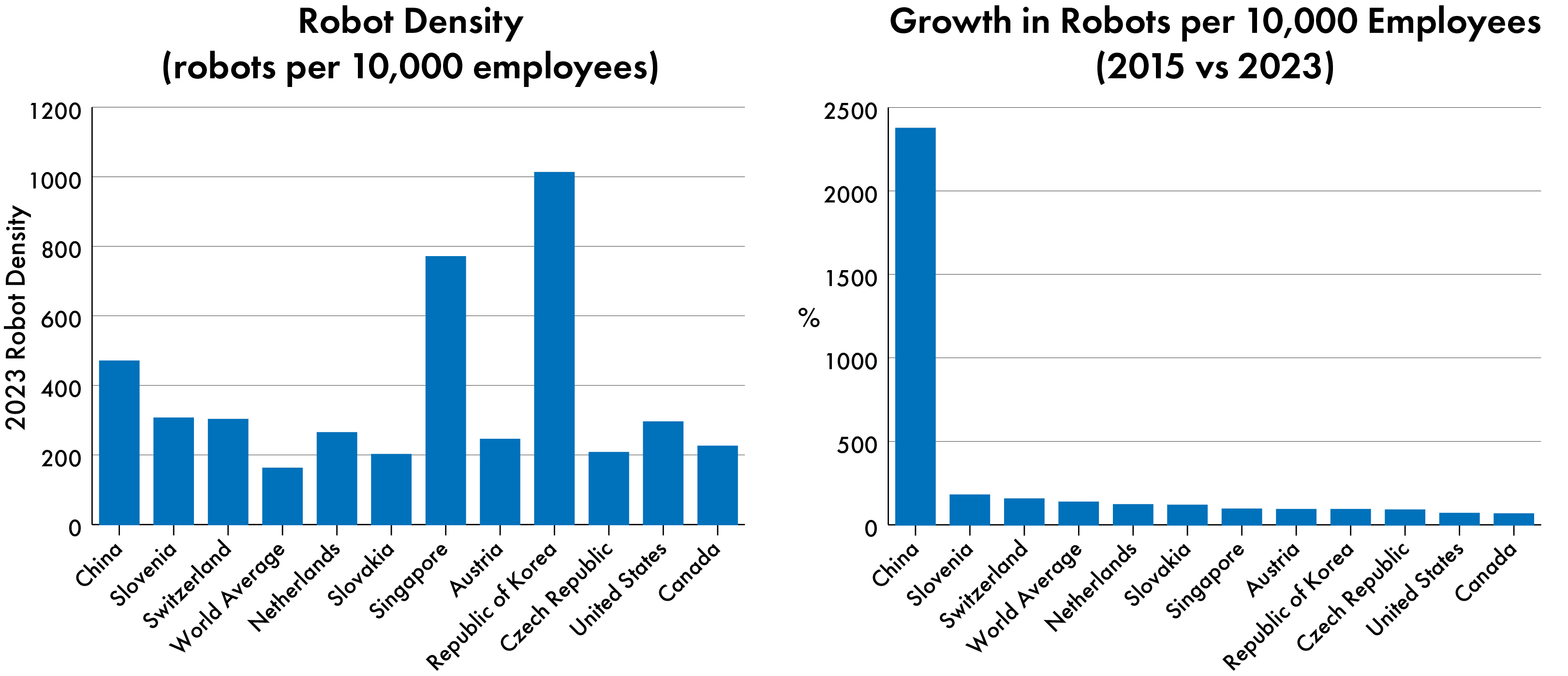 Although China’s EV triumph is often highlighted, a lesser known but correlated success from MIC2025 is the dramatic growth in industrial robot installations. Worldwide, the density of factory robots (the number of robots per 10,000 people) has more than doubled since 2015. But that figure is almost single handedly inflated by growth from China, where robot density ballooned a staggering 2,400 percent between 2015 and 2023.