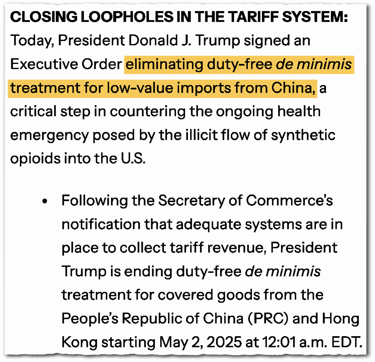 China hawks, worried about the loophole’s conduit role in fentanyl trafficking, and industry associations that decried an unfair advantage for foreign producers both celebrated when the Trump administration announced an end to the exemption for Chinese goods starting on May 2, with the rest of the world to follow on August 29. Some even proclaimed Temu and Shein’s impending demise.