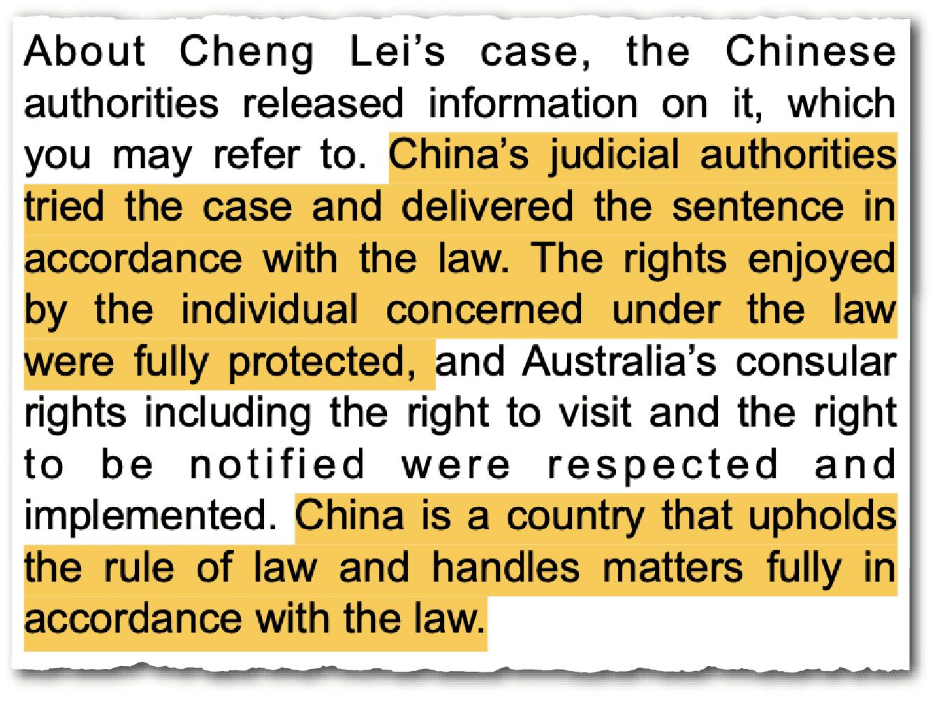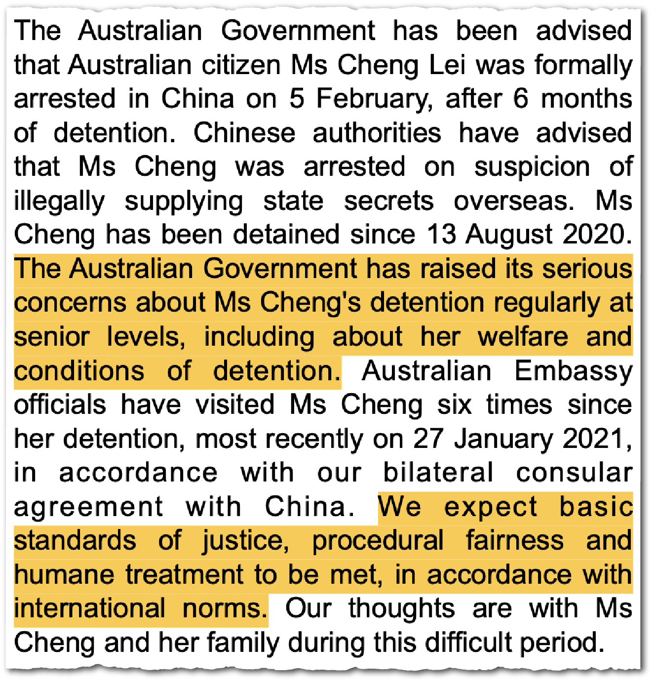 Cheng learned in detention that the specific ‘crime’ she had been arrested for was texting a Bloomberg reporter, Haze Fan, thereby breaking an embargo on the results of then-Premier Li Keqiang’s government work report in May 2020. The mother of two spent three years and two months behind bars in a MSS detention facility, before she was released and returned to Australia in October 2023.
