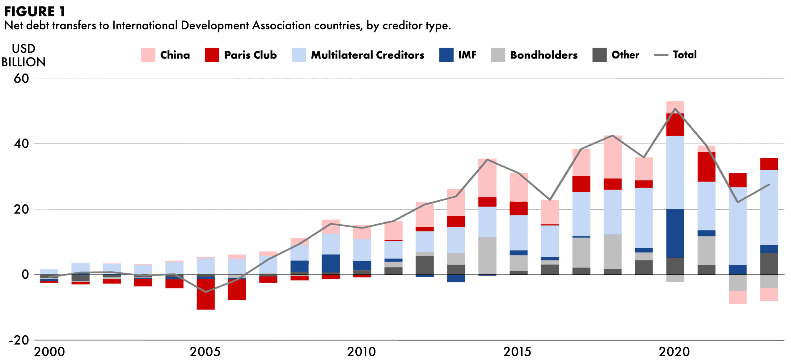 That’s the good news. The bad news is that China has pulled back on sovereign lending to low-income countries at the same time as private lenders have also retreated. In 2022 and 2023, countries eligible for concessional lending through the International Development Association (IDA), an arm of the World Bank for the poorest countries, sent more money to repay China and bondholders than they brought in through new loan disbursements. Figure 1 shows how these reversals have dampened the financing available for IDA countries.